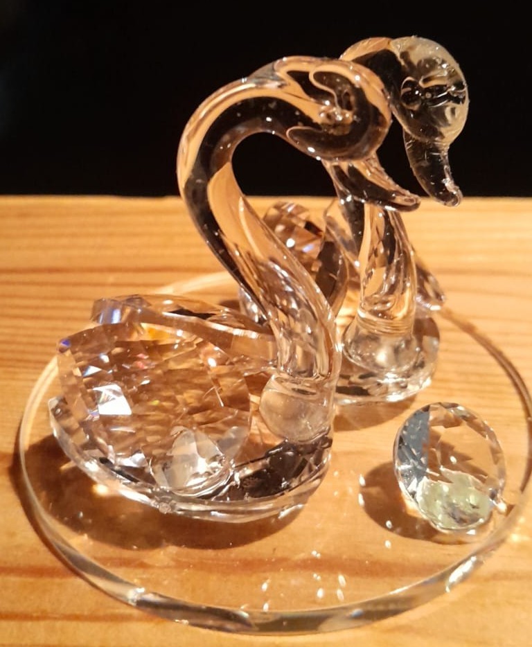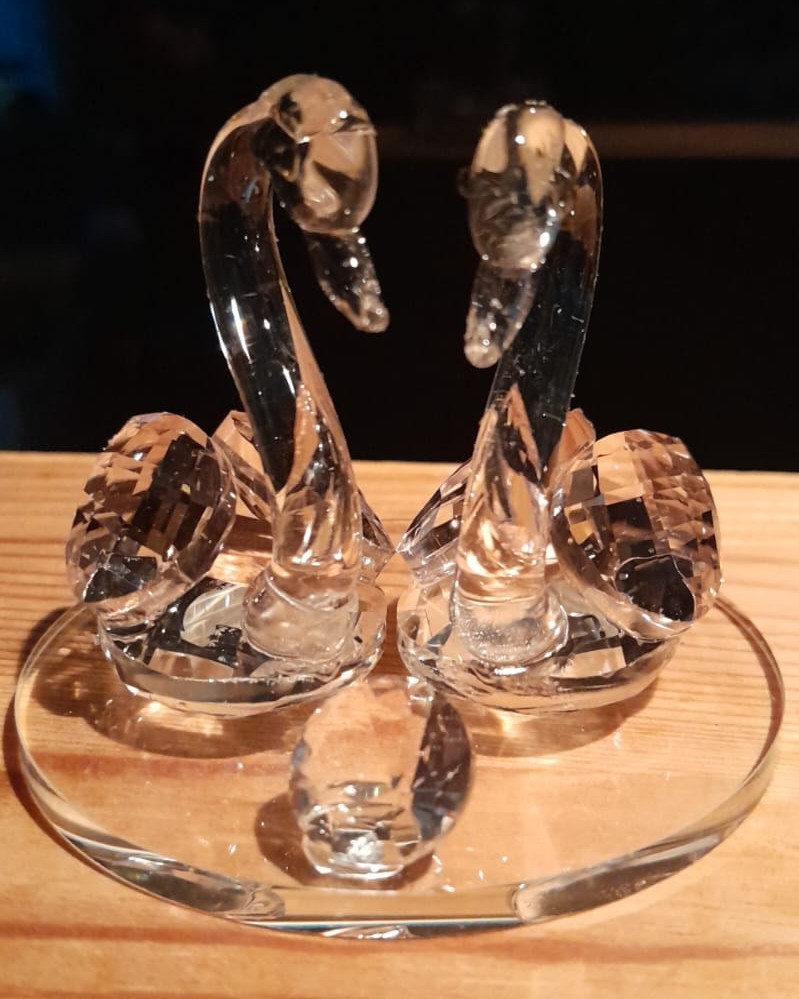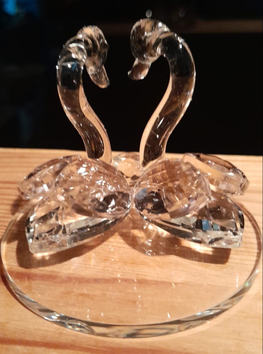 Deux cygnes en résine, effet cristal dont les ailes sont tres légèrement rosées.