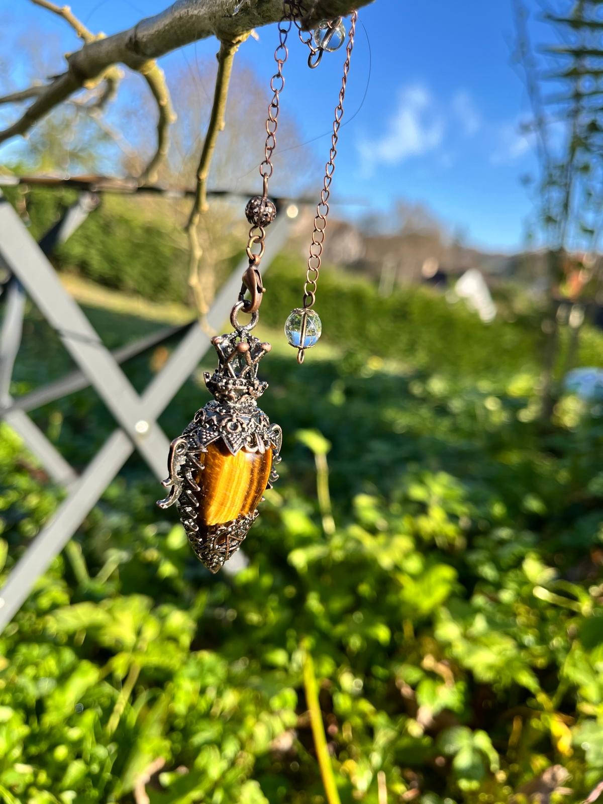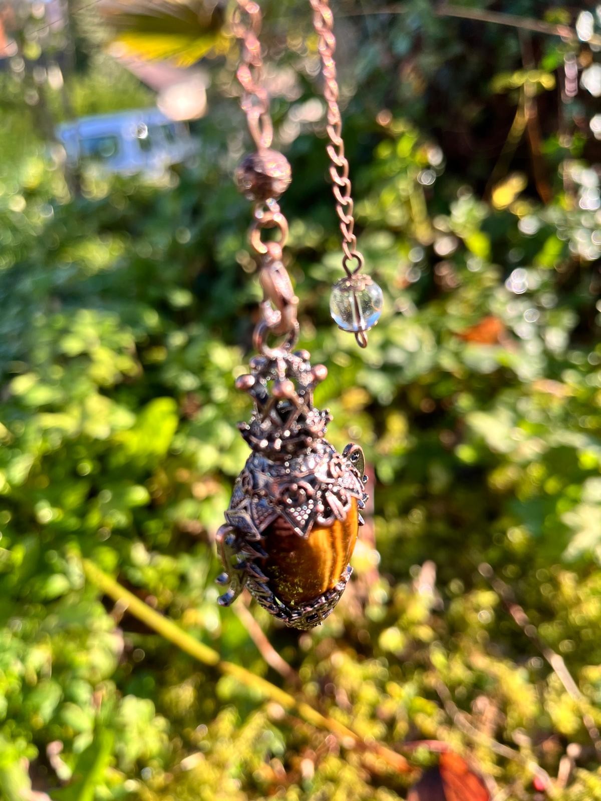 Ce pendule est taillé dans une élégante forme de goutte en Œil de Tigre véritable. Le sertissage en métal travaillé (couleur bronze antique) lui confère un aspect mystérieux et royal.