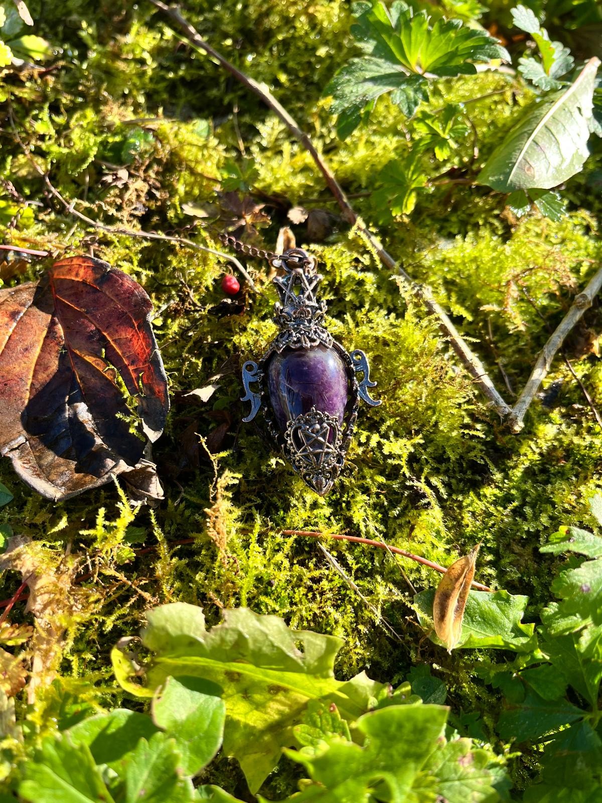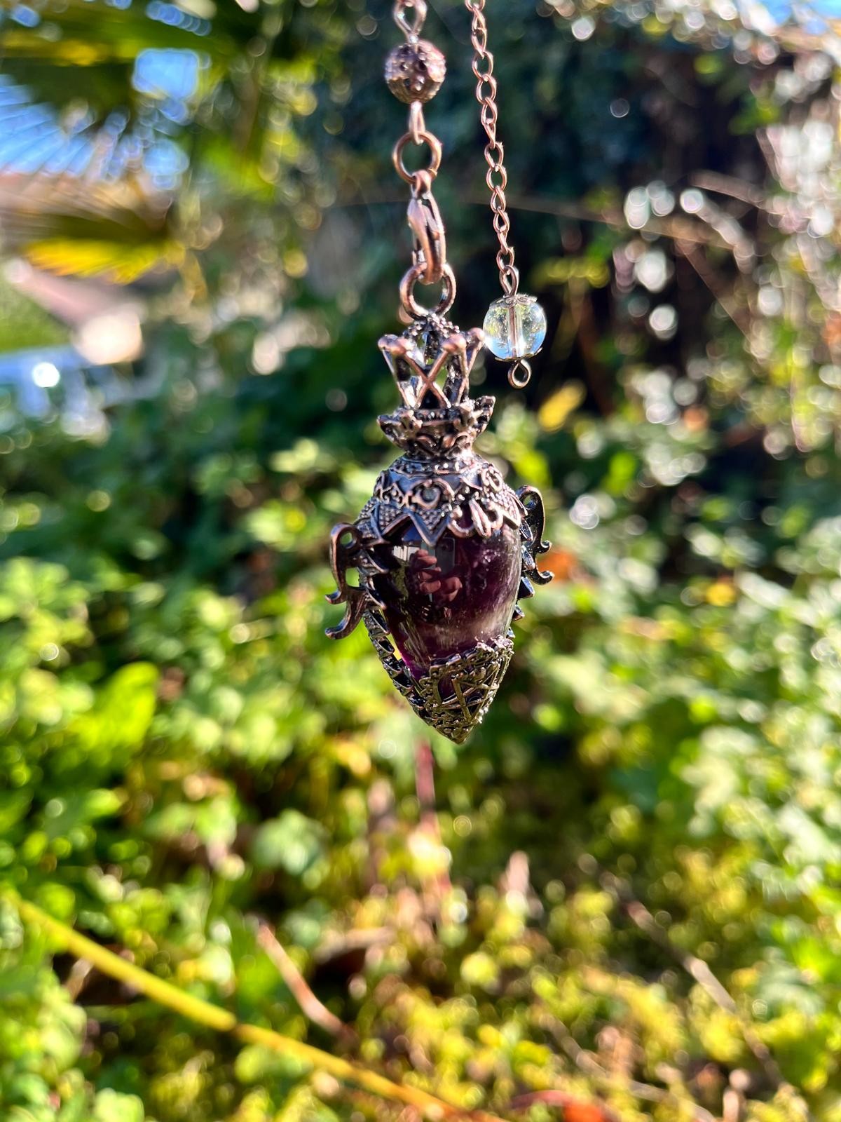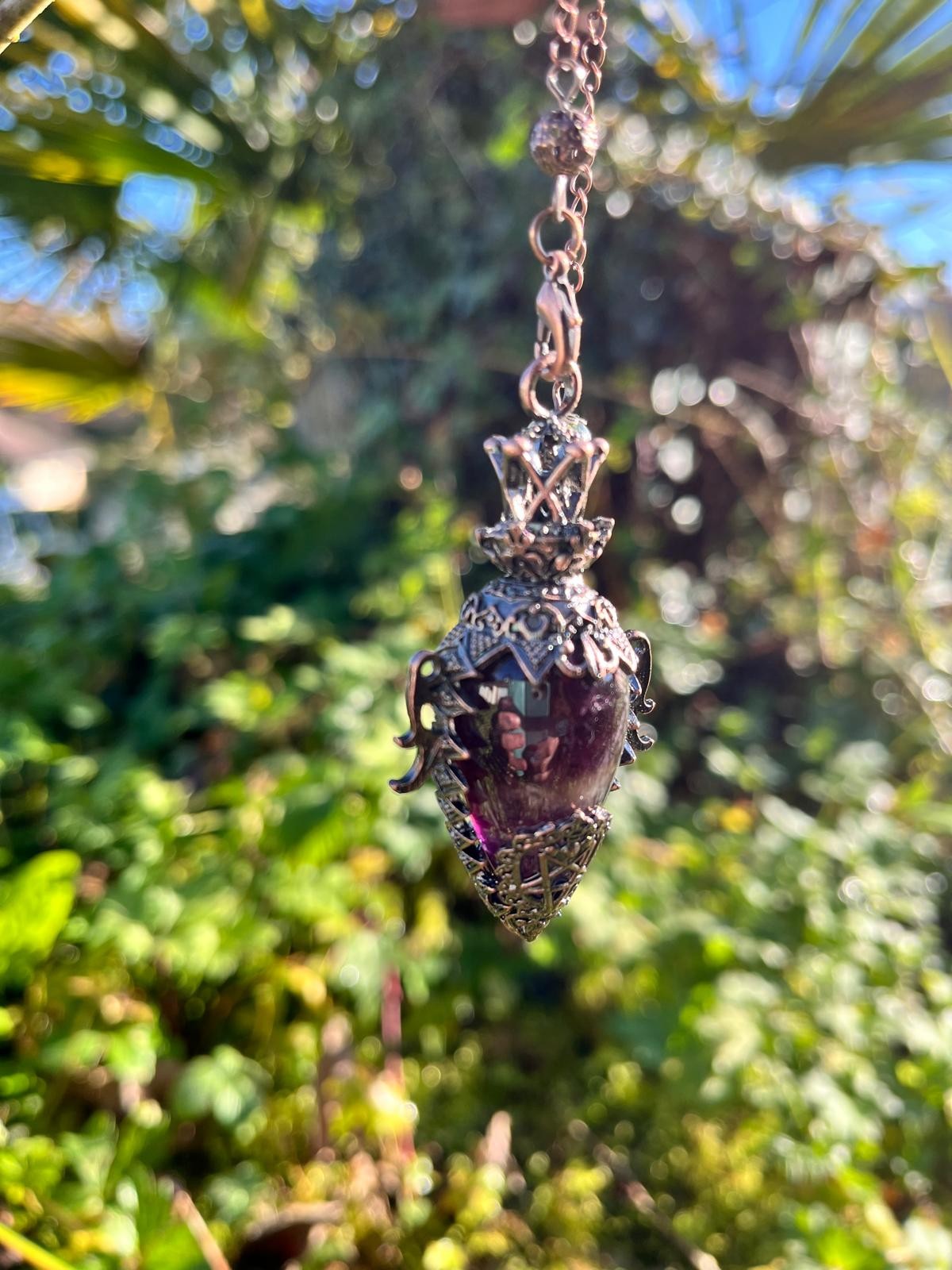 Ce pendule est taillé dans une élégante forme de goutte en Améthyste véritable, la pierre de la spiritualité. Il est orné d'une monture détaillée et travaillée (couleur bronze foncé) qui lui confère une présence mystique et raffinée.
