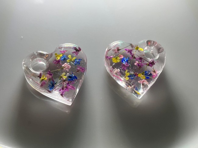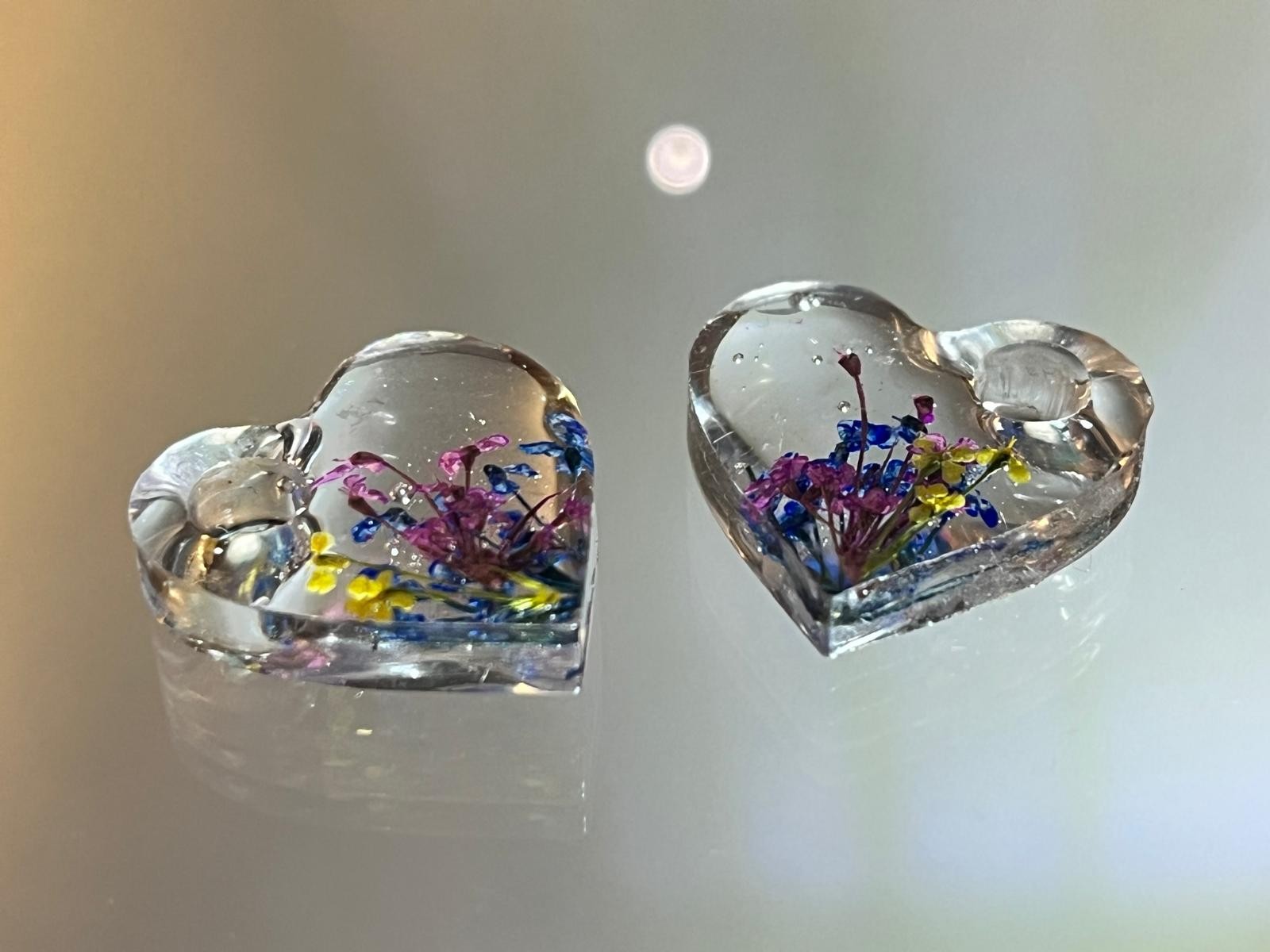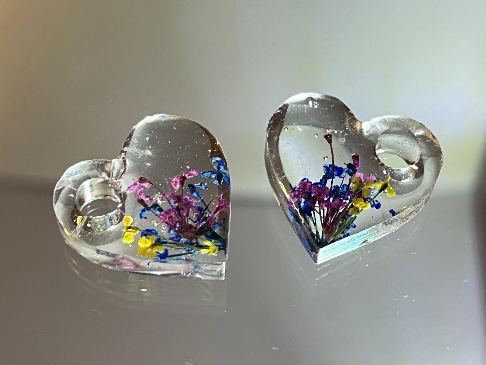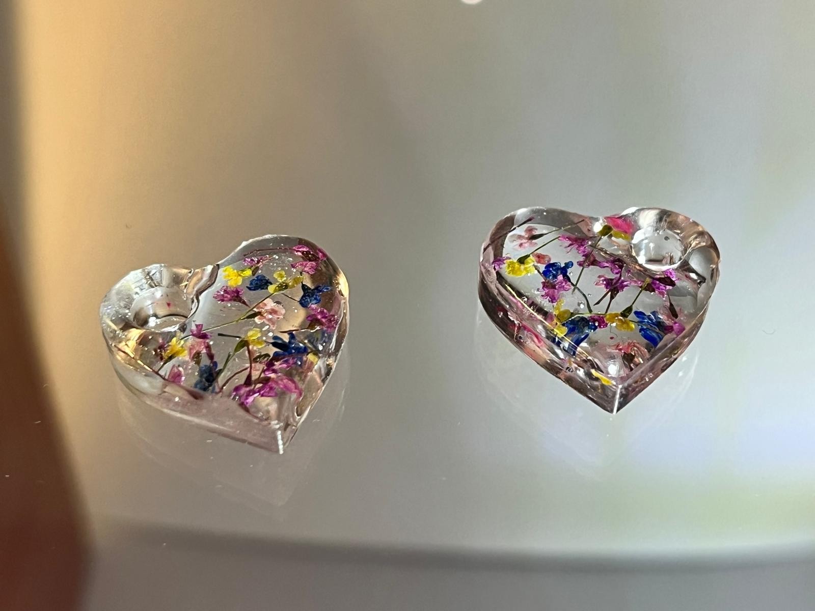 Laissez vous séduire par la douceur de ces boucles d'oreilles uniques, entièrement façonnées à la main. Chaque cœur renferme de véritables fleurs séchées, figées dans une résine transparente pour un rendu poétique et printanier. ✨